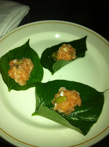 On the right: Salmon tartar, pumpkin seed, shiso leave
