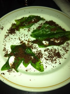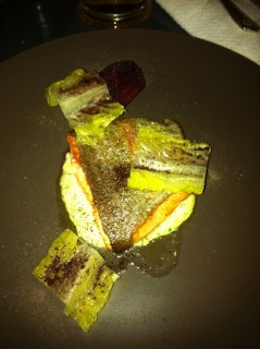 2nd course: Pan seared trout, compressed romaine, marinated beet, red nori powder, gribiche sauce