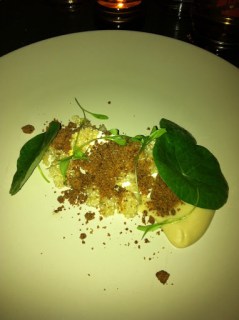 1st course: Pumpkin and yogurt, smoked eggplant puree, buckwheat crumbs, quinoa, cilantro sprouts, nasturtium leaves