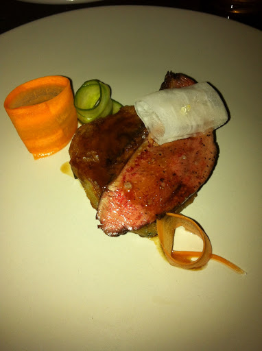 3rd course: Pan seared duck breast, onion pancake, pickled shaved vegetables, white soy