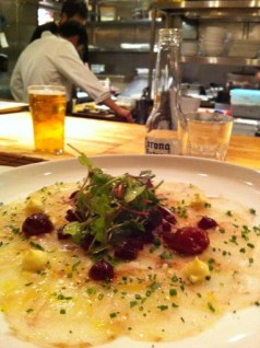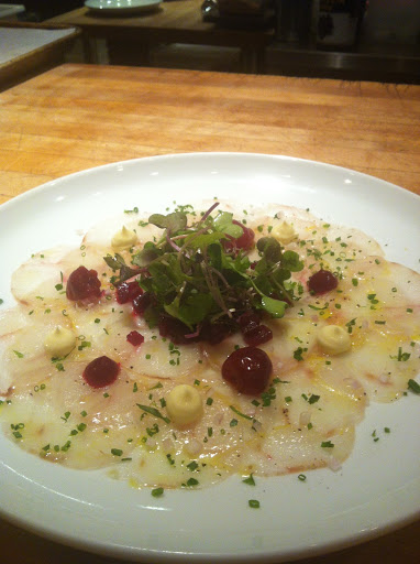 Flounder Carpaccio with lemon aioli, cherries and beets.