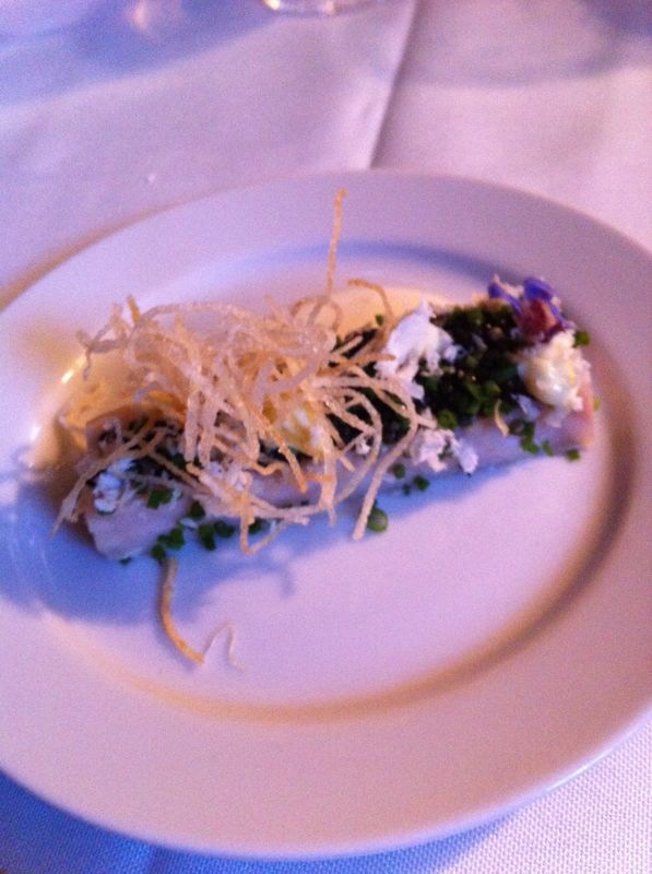 Caviar, horseradish, creme fraiche, fried potato, chive flowers, egg yolk emulsion