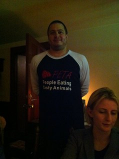 One of our server wearing a very interesting shirt. PETA (People Eating Tasty Animals)