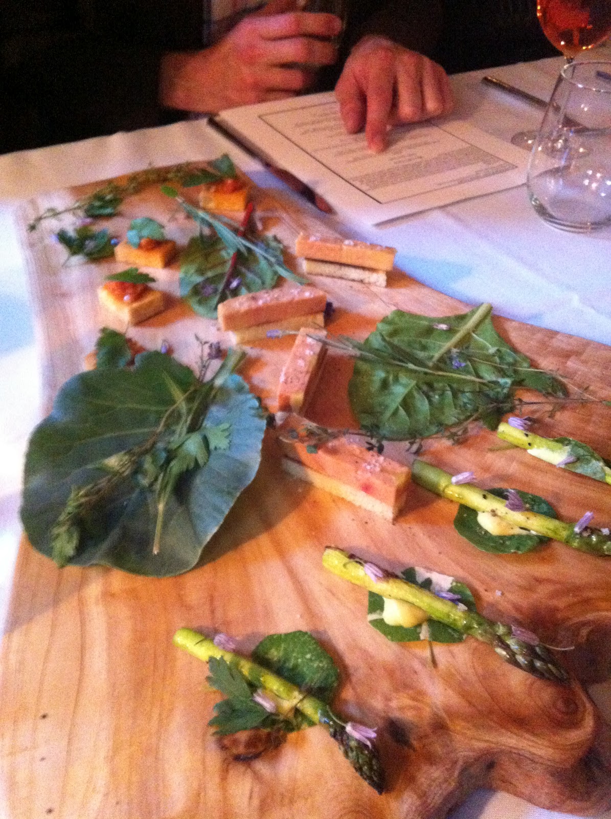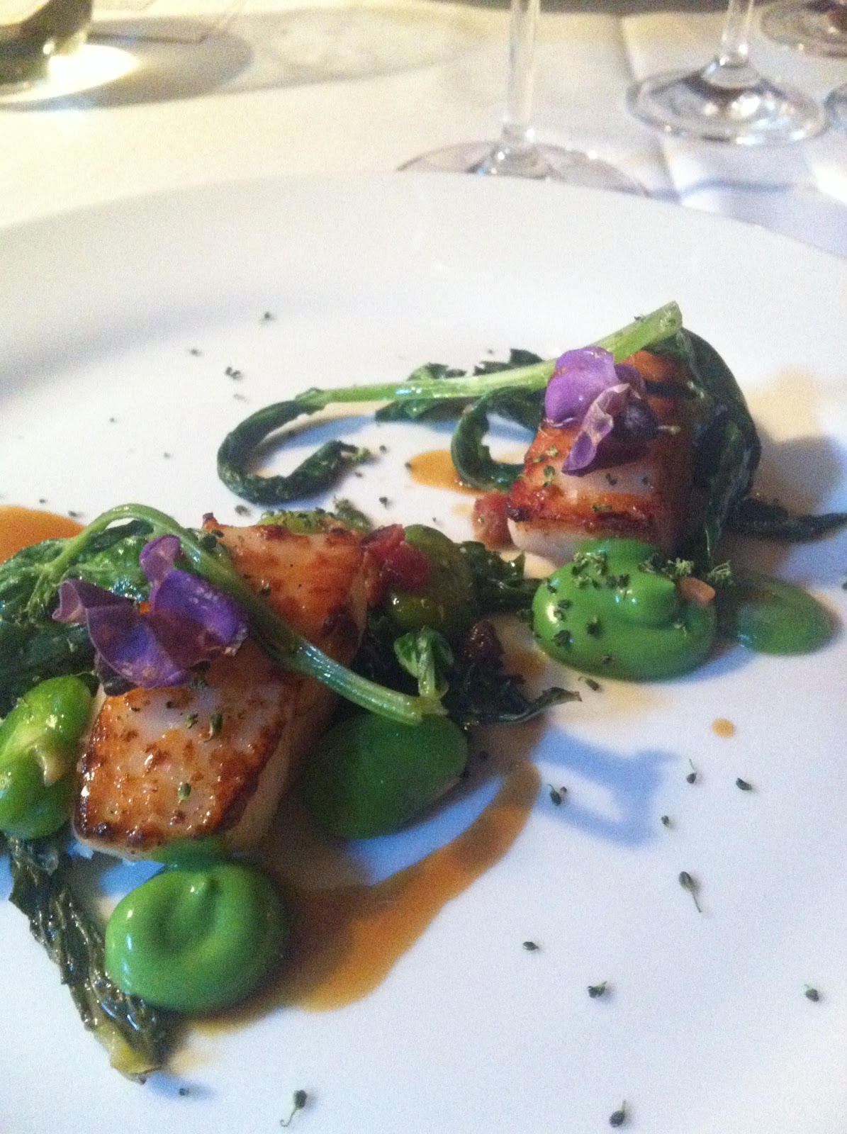Whipped foie gras sauce, peas, pigeon & vinegar sauce, pea sprouts, pigeon cracker