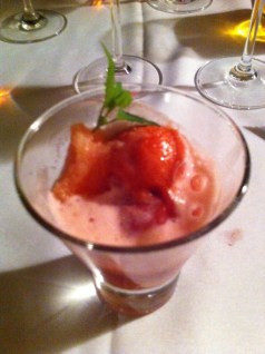 Tapioca, sorbet, strawberry, rhubarb soda, compressed strawberries
