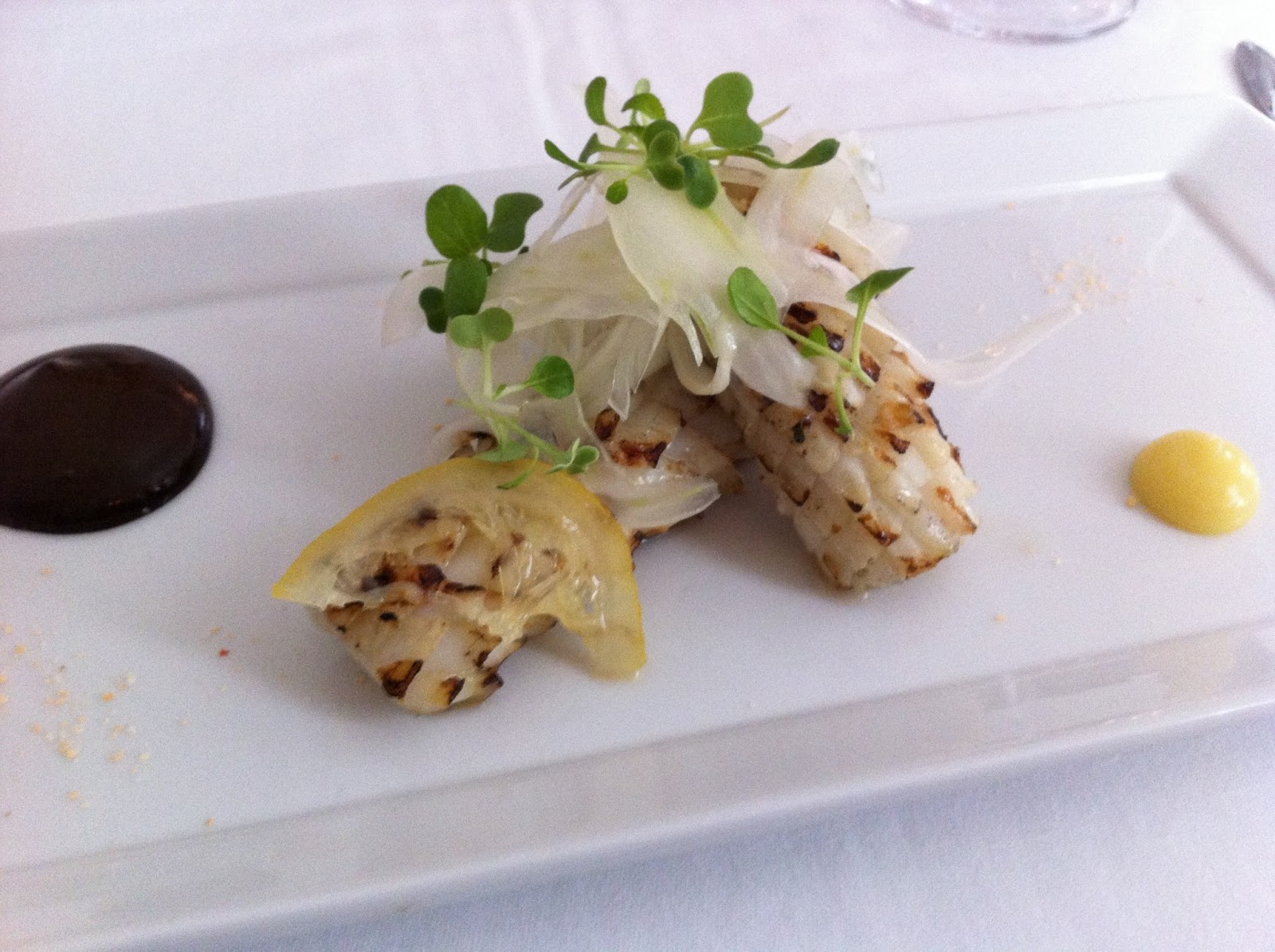 The grill calamari was served with a shaved fennel slaw on top. The most interesting part on this dish was the balsamic and lemon dipping sauce. The balsamic sauce had a molasses/ aioli consistency, which was paired what seemed to me as a lemon curd.