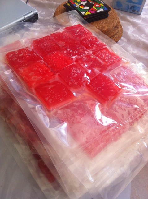 The watermelon was sliced to 1/4″ thickness and cut into squares. The squares are then arranged in vacuum chamber pouches and sealed on high with 1.5 Tbsp of liquid of your choice. (In this case, lime and ginger syrup)