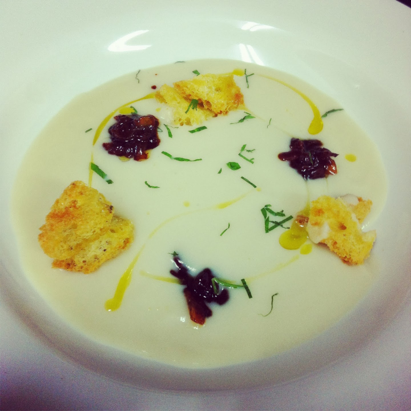 I served it in a Jerusalem artichoke soup with bacon jam, olive oil and parsley.