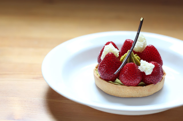 Pistachio ganache tart with compressed strawberries and chocolate garnishes