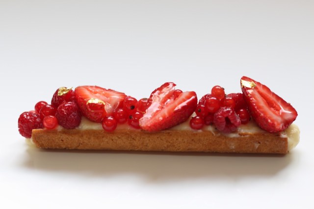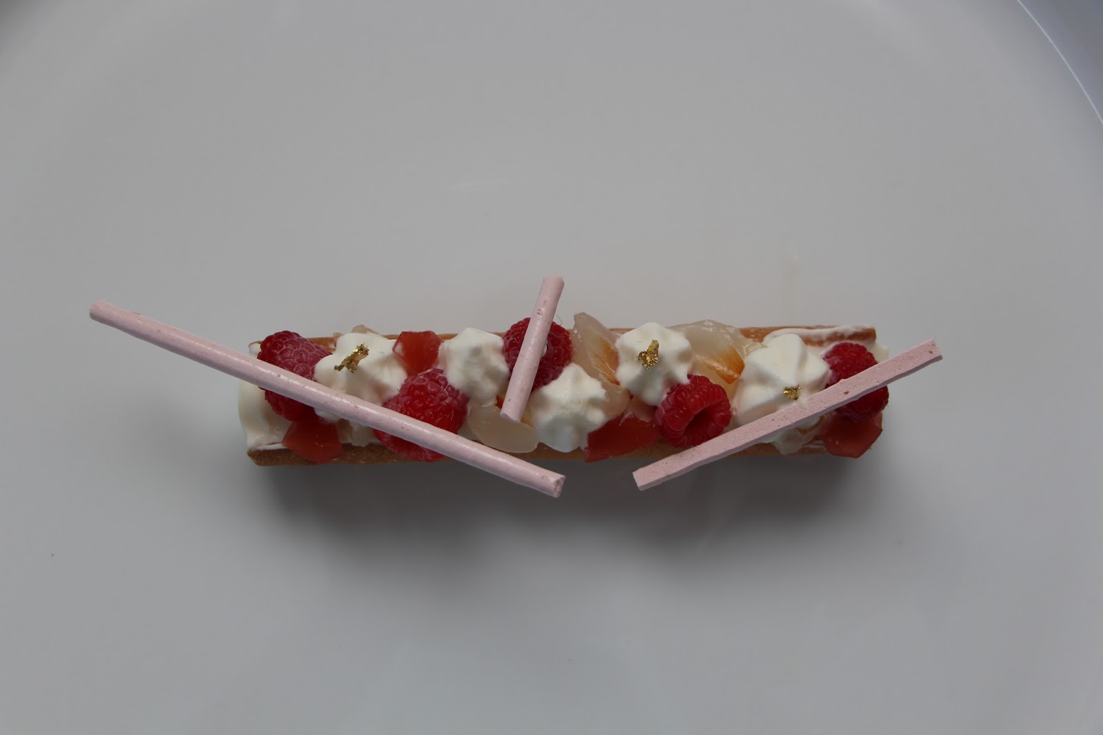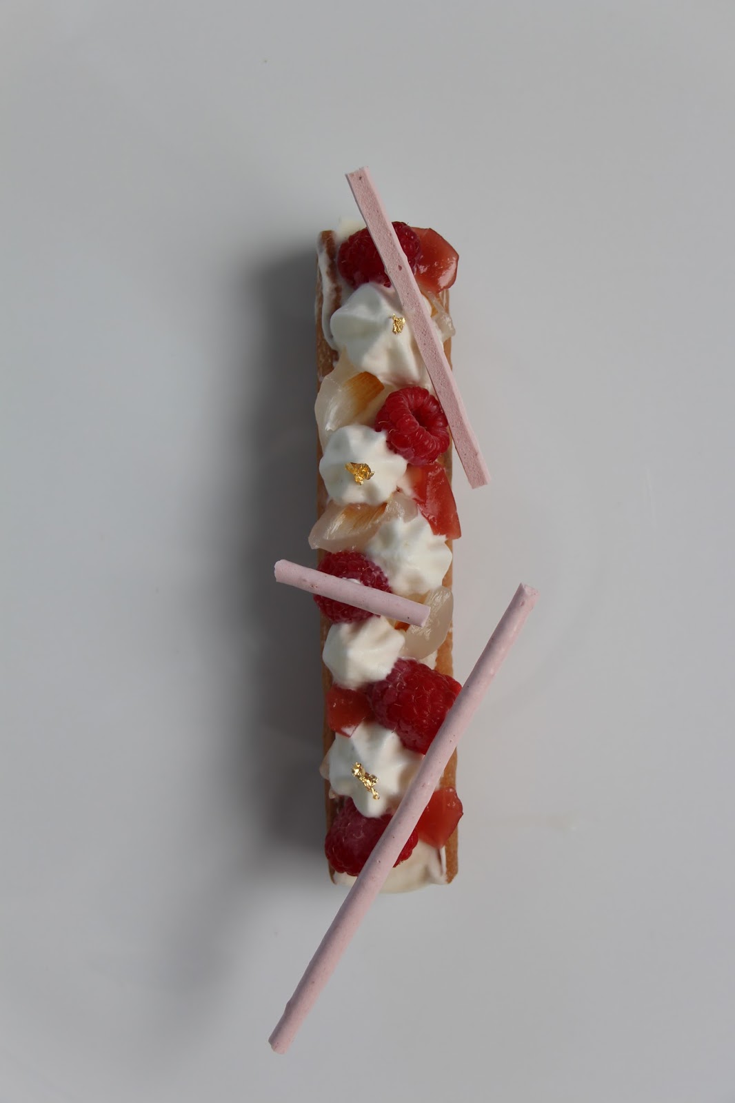 The last tart, Ispahan, is a half pipe tart with a classic combination of raspberry, lychee, and rose. In this case, we have a diplomat cream (a mixture of pastry cream and whipped cream), rose chantilly, raspberries, lychee, Ispahan meringues and crystallized rose petals which I forgot to put on.