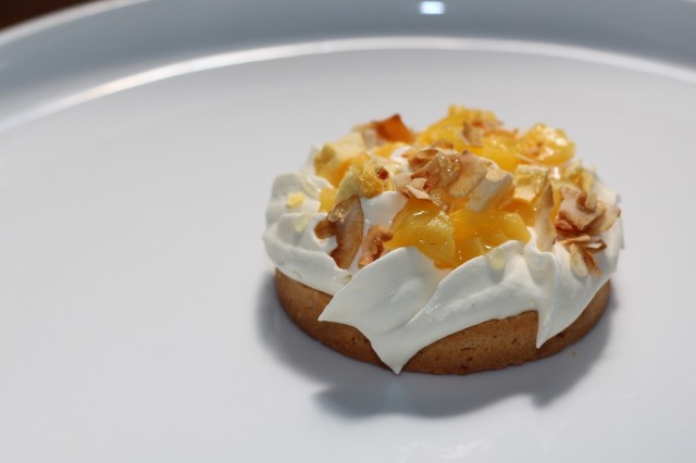 “If you like Piña Colada and getting caught in the rain (or pastries)”, you’re going to like this. In this second version, the piña colada has a coconut pastry cream, a coconut diplomat, topped with diced pineapples, freeze dried pineapples, coconut flakes and a lime fluid gel.