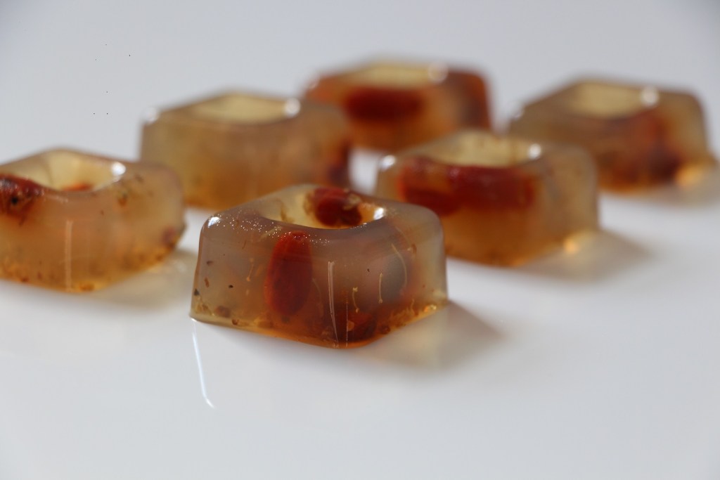 **Alternatively, you can add the mixture to the moulds directly. Then, as it starts to thicken, stir with toothpick to distribute the goji berries and flowers. The idea is to avoid having everything settle at the bottom.