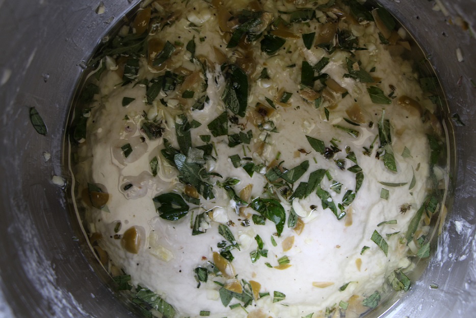 - If you want to incorporate some of your topping into the crumb of the dough, you can pour some of the mixture (e.g., the herb oil) onto the dough every time you do a stretch and fold.