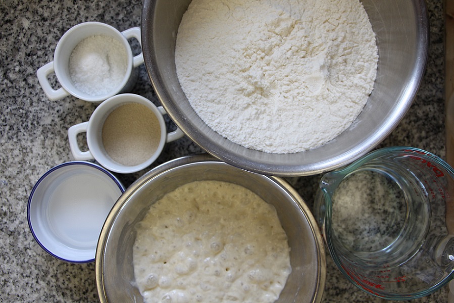 1. Mix poolish by combining water (1), bread flour and instant yeast and let it sit for 12 hours at room temperature.
