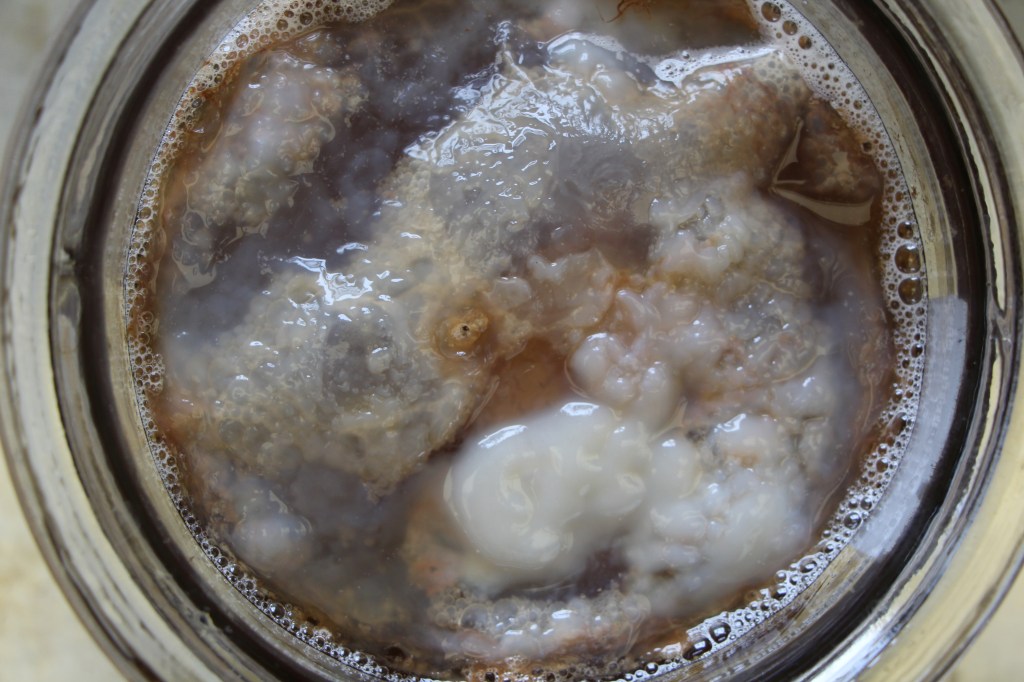On Scoby: Scoby is an acronym for “symbiotic culture of bacteria and yeast”. For a Scoby to survive and thrive, it needs 3 things: a place to live, food to eat, and oxygen so it can breathe. The size of the Scoby added to the ferment can vary, but you want to cover a minimum of 25% of the surface area of your liquid.