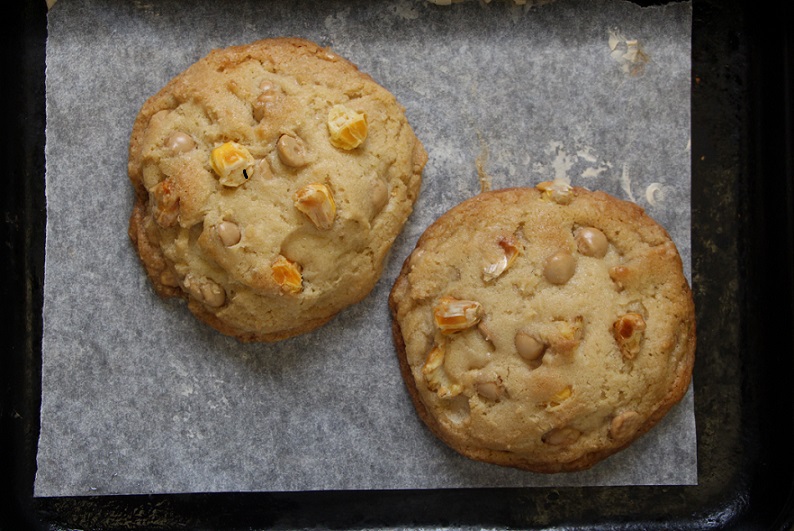 For this cookie, we use Tara’s recipe but substitute 340 g Callebaut gold chocolate and 100g half-popped popcorn (plus more to finish) for the original 340g chocolate. Since the popcorn is salted, we also omitted the sea salt sprinkled on top. The adaptation yields about 22 cookies, portioned with a yellow scoop (3-1/2 Tbsp).