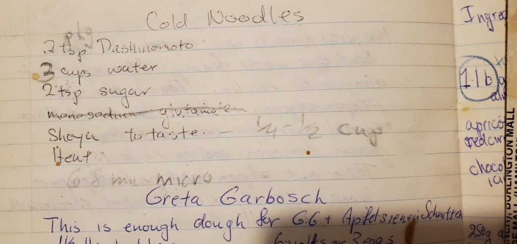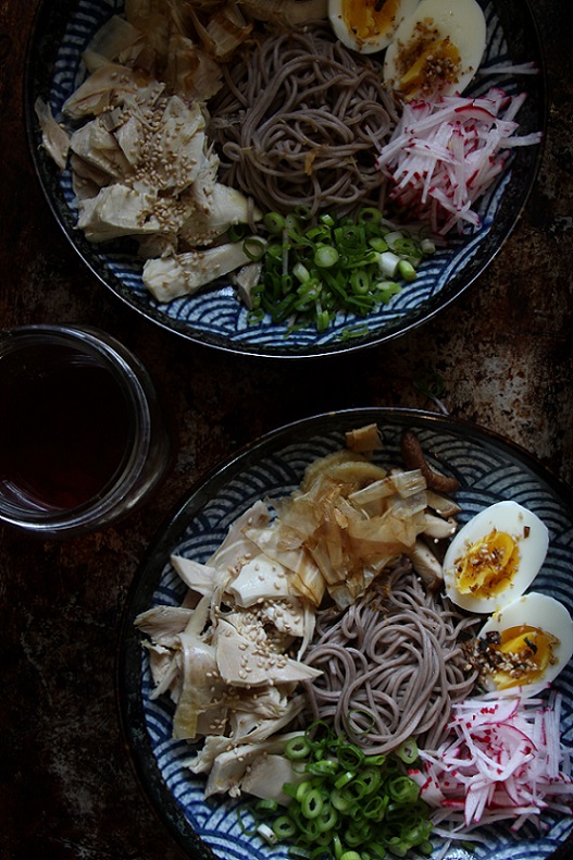 The original recipe for cold noodles (shown above from mom’s recipe book) comes from my grandma. This dish was a summertime favourite growing up. Especially in the pre-air conditioning days. They can be made in advance, and they require minimal stove/oven time (read: heating up an already hot kitchen). Growing up, we would typically have the sauce with cold somen (super skinny noodles). We would always serve it in a tall water glass: piled high with noodles and topped simply with green onions and sauce. Here, we used buckwheat noodles (soba) and got a little fancier with our toppings and presentation. Either way, cold noodles are a perfect meal on a hot day – and we’ve had plenty of those lately! If you’ve never had them before, we definitely recommend you give either version a try.