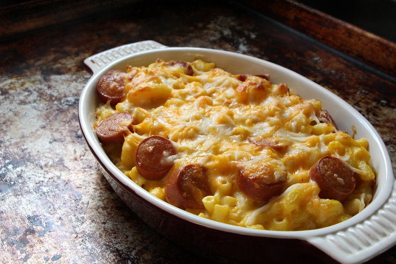 This meal came about as the intersection of two lines of thought. We wanted to try out the old fashioned (original) macaroni and cheese recipe, as featured on the Netflix series High on the Hog (recommended, by the way!). And, I’d been wanting to try adding butternut squash to macaroni and cheese ever since we ended up with way too many (is there such a thing) squash last fall. Earlier this week we finally got around to trying a mix of the two…we cooked the macaroni in equal parts milk and water (4 cups and 4 cups), then used the leftover cooking liquid (about a litre) to make the sauce with a roux: melted 5 Tbsp (75g) butter and softened some diced garlic and onions in it; added 1/4 cup (34g) flour and cooked it for about a minute, seasoned with salt and paprika; slowly added the reserved cooking liquid (we were able to use all the liquid from cooking the pasta, so the water and milk didn’t have to go to waste) and brought everything to a boil; added about 2 cups (300g) cubed butternut squash and let simmer for about 45 minutes. After that we added some cheese (shredded, mixed cheddar, about 1 cup) and stirred to combine with the macaroni. We added hot dogs (obviously), divided it into 3 baking dishes (good portions for 2 people), and topped with breadcrumbs and extra cheese before baking (and freezing for later).