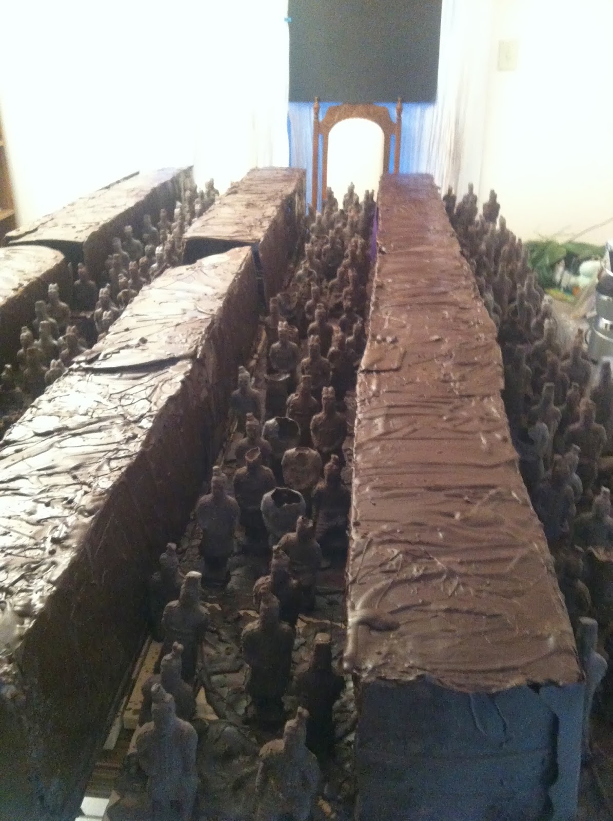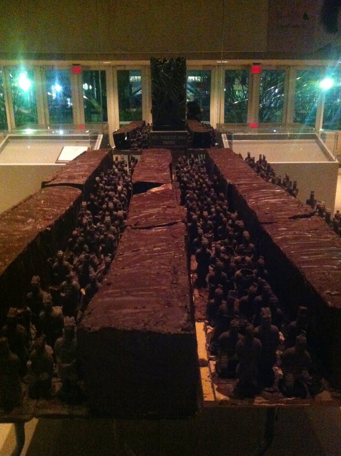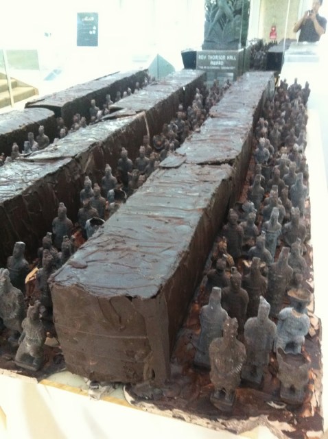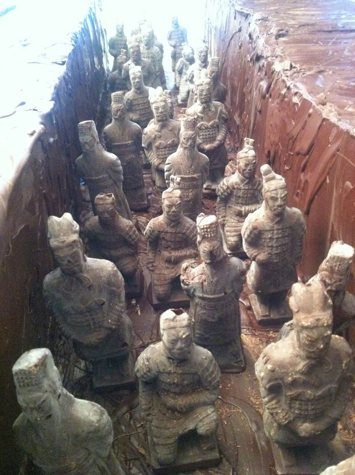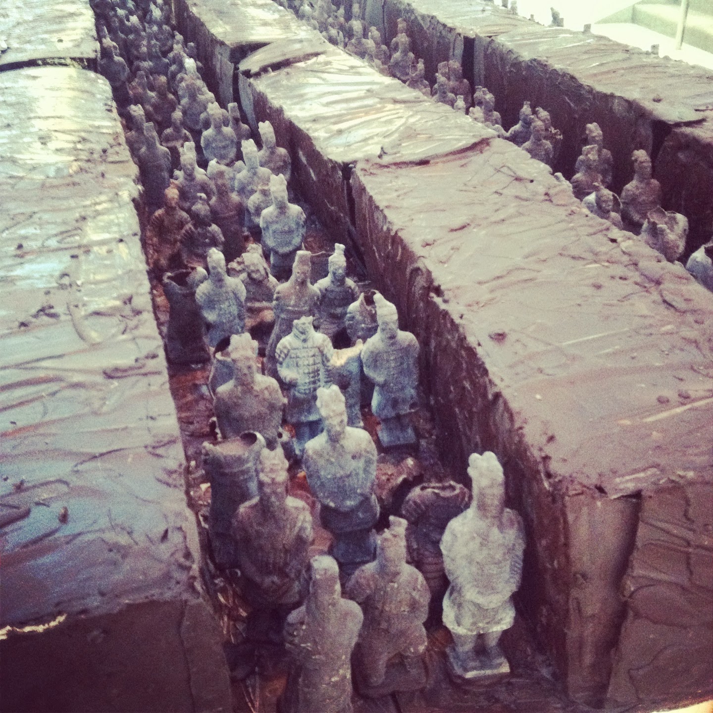 Our Chocolate Terracotta Warriors include 4 styles of figures in various poses casted in the amount of several hundreds. The installation depicts soldiers in one of three pits. Our current estimates are that there are approximately 150 kilograms of chocolate used in this making of this installation. This piece took hundreds of hours to make and took over 3 months.