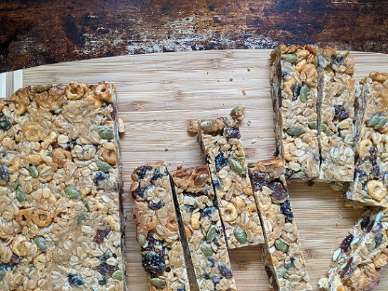 5 minute granola bars with oats, cheerios, raisins, dried cranberries, and pumpkin seeds.